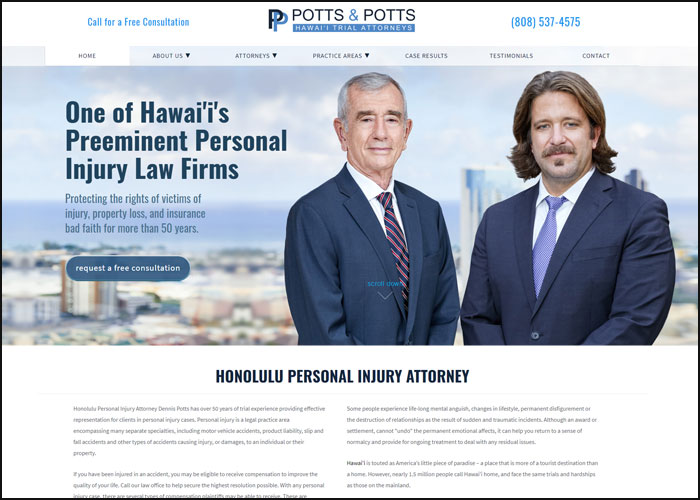 Dennis W Potts has been defending injury victims for over 30 years as a skilled Honolulu Personal Injury Lawyer in auto accidents claims, personal injury claims, premises liability claims, legal and medical malpractice claims, insurance bad faith claims, and product liability claims. Call their Hawaii Car Accident Lawyer today to get the help and results that you deserve!