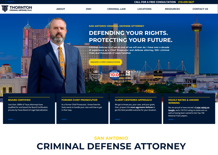 Thornton Criminal Defense, PLLC is a leading provider of criminal defense services in San Antonio and across Texas. Headed by seasoned attorney Brad Thornton, the firm offers strong support and successful legal strategies for cases ranging from misdemeanors like DWI to major felonies, including murder. Brad Thornton’s previous experience as a Chief Prosecutor gives him valuable insight into both sides of the courtroom, allowing him to deliver exceptional defense for his clients.